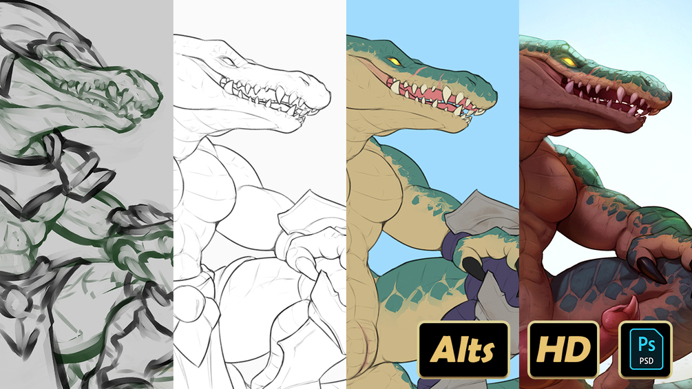 - Accompanied by work-in progress steps from sketch, to lines, to flats and alternate versions